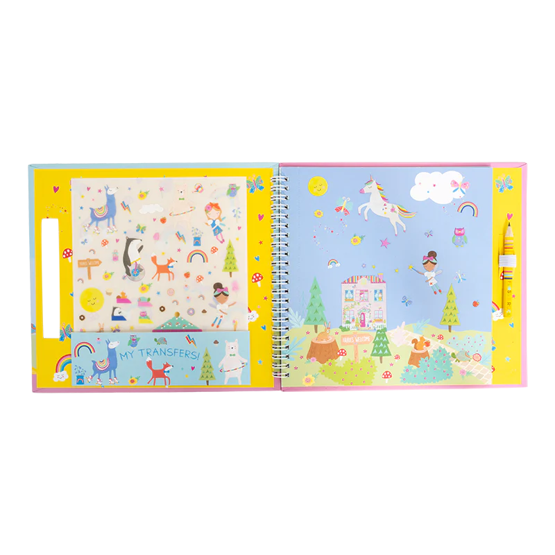 There's so much fun to be had with Transfers! This Rainbow Fairy Transfer Fun comes with over 150 brilliant Rainbow Fairy themed transfers, 6 colourful scenes to place them onto, 6 plain pages for freestyle doodling and a Floss & Rock pencil. Open the spiral bound book to find all your transfers neatly stored in the 'My Transfers' pocket, find your chosen illustration and flick through the pages to find the perfect scene to put them onto. Scratch over the top of the drawing with the pencil provided and lift up the sheet, like MAGIC you'll find them transferred onto the page. Spend many happy hours sparking creativity and making beautiful pictures with fairies, unicorns, llamas and more.
