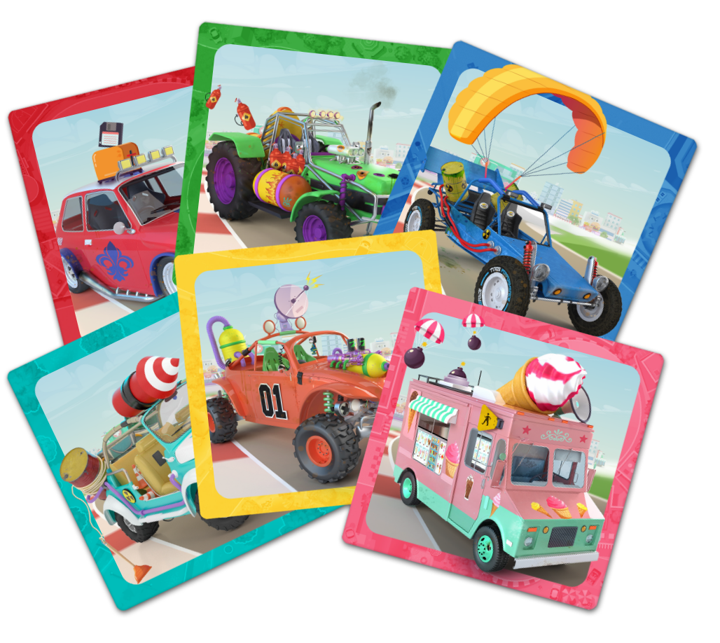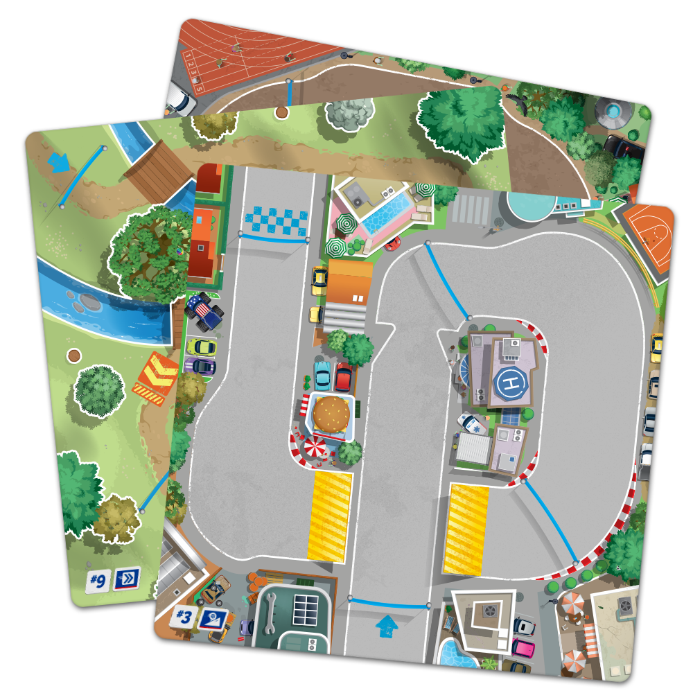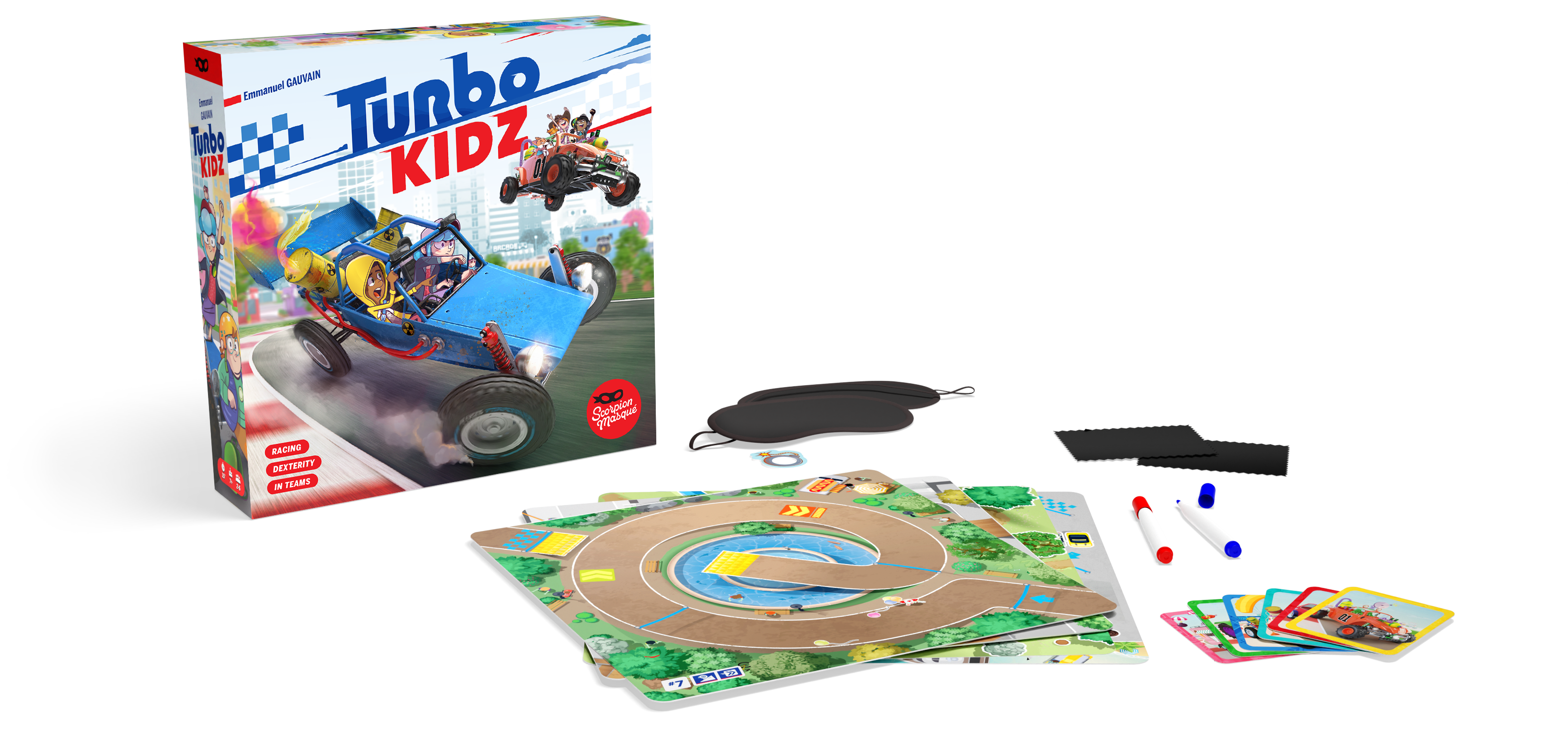 Either cooperatively or competitively, be the first to cross the finish line in a series of hilarious races...blindfolded!In Turbo Kidz, the Driver covers their eyes and must draw their circuit as fast as possible while still staying on the road. Their Co-Pilot guides them with their voice while moving the Driver’s thumb like a joystick and prevents them from going off the road!