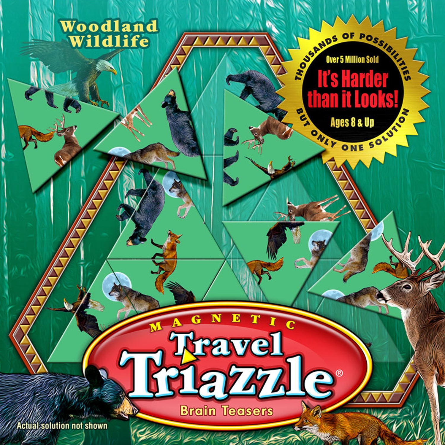 Travel Triazzles provide a challenge to take along with you! Nine wooden pieces are kept in a bi-fold booklet. Remove the triangular pieces from the game board and mix them up. Then replace all the pieces so that each picture matches. It's harder than it looks!