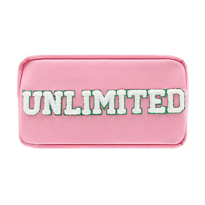 Calling all "Wicked" fans: discover stylish on-the-go organization and show the world that nothing can bring you down! This must-have pink nylon bag features the word "UNLIMITED" in fluffy white chenille, outlined in glittery green. Fill it with small toys, hair supplies, makeup... you name it. We love the bright gold zipper and green and pink stripes inside this 10" x 5.5" x 3.5" bag. Pair with the Glinda Sequin Headband for a magical gift.From Mavi Bandz for ages 3+ yrs.