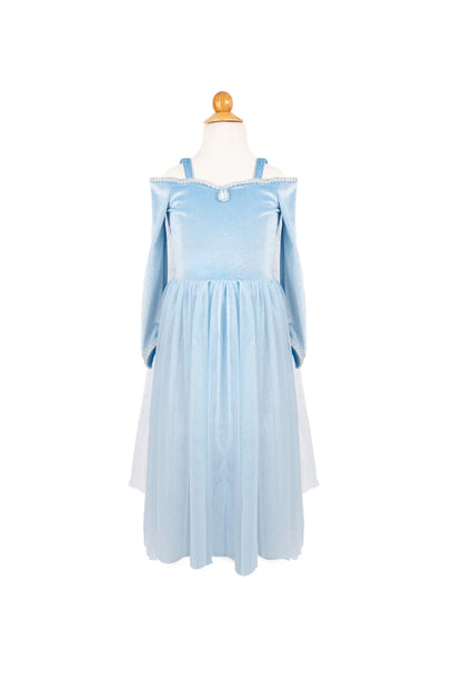 Step into a world of enchantment with the Velvety Soft Sisters Forever Princess Dress, a magical creation inspired by the bond of sisterhood. The light blue velvet top offers a soft, luxurious feel, while the spaghetti straps and off-the-shoulder long sleeves add a touch of elegance. The top is beautifully trimmed with silver accents and features a sparkling blue gem in the center of the chest, adding a royal flair.
