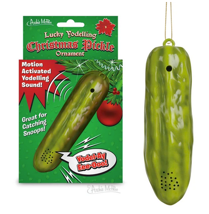 Some families put a pickle on their tree on Christmas Eve, and the child who finds it first the next morning gets a year of luck. While some say the Germans came up with this tradition, people in Germany have never heard of it. Let's not let the implausibility of a tradition prevent us from having fun with it. Our plastic Lucky Yodelling Christmas Pickle Ornament is not a only sanitary alternative to an actual pickle, it is also equipped with a motion detector that goes off whenever someone gets within about three feet of it. You can set up the ornament near the presents to act as an alarm when someone snoops. Buy a bunch of them and you'll have a chorus of yodels whenever someone walks past your tree. Now that's what we call a lucky Christmas. Batteries included. Pickle has an on/off switch. Endorsed by Santa Pickle.